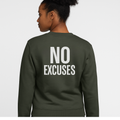 Each No Excuses Edition crewneck is produced only when ordered to reduce waste. Production time is about one week, with tracking sent once shipped.